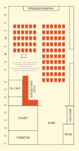 Планировка банкетного зала позволяет размещать гостей так, чтобы все могли комфортно разместиться за столами, чтобы еще осталось место для танцев и конкурсов.