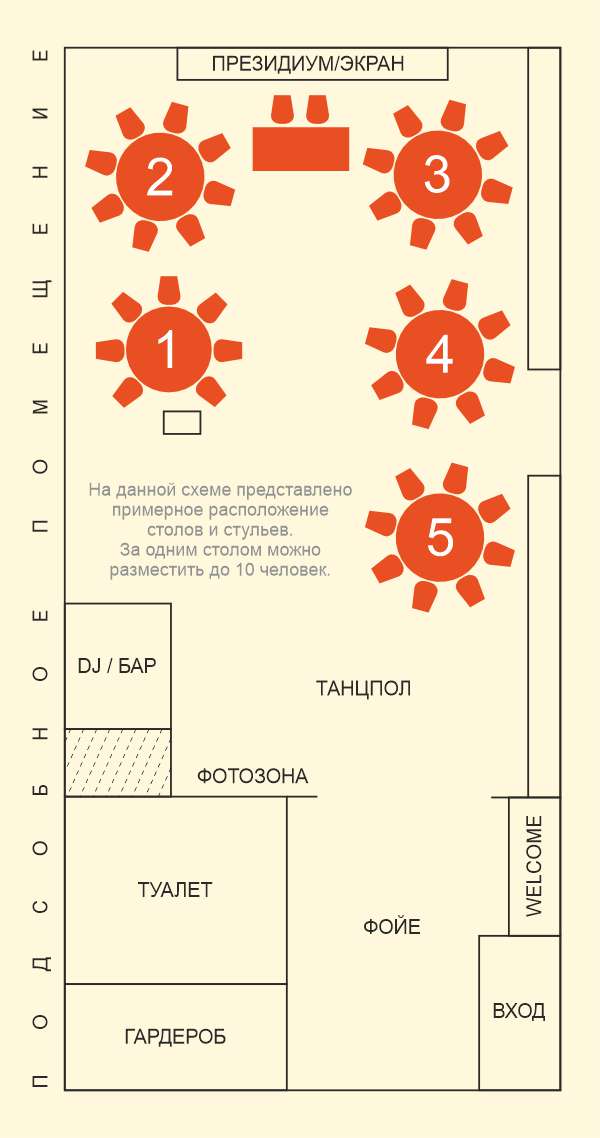 5 круглых столов. За каждый стол комфортно размещается до 10 человек.